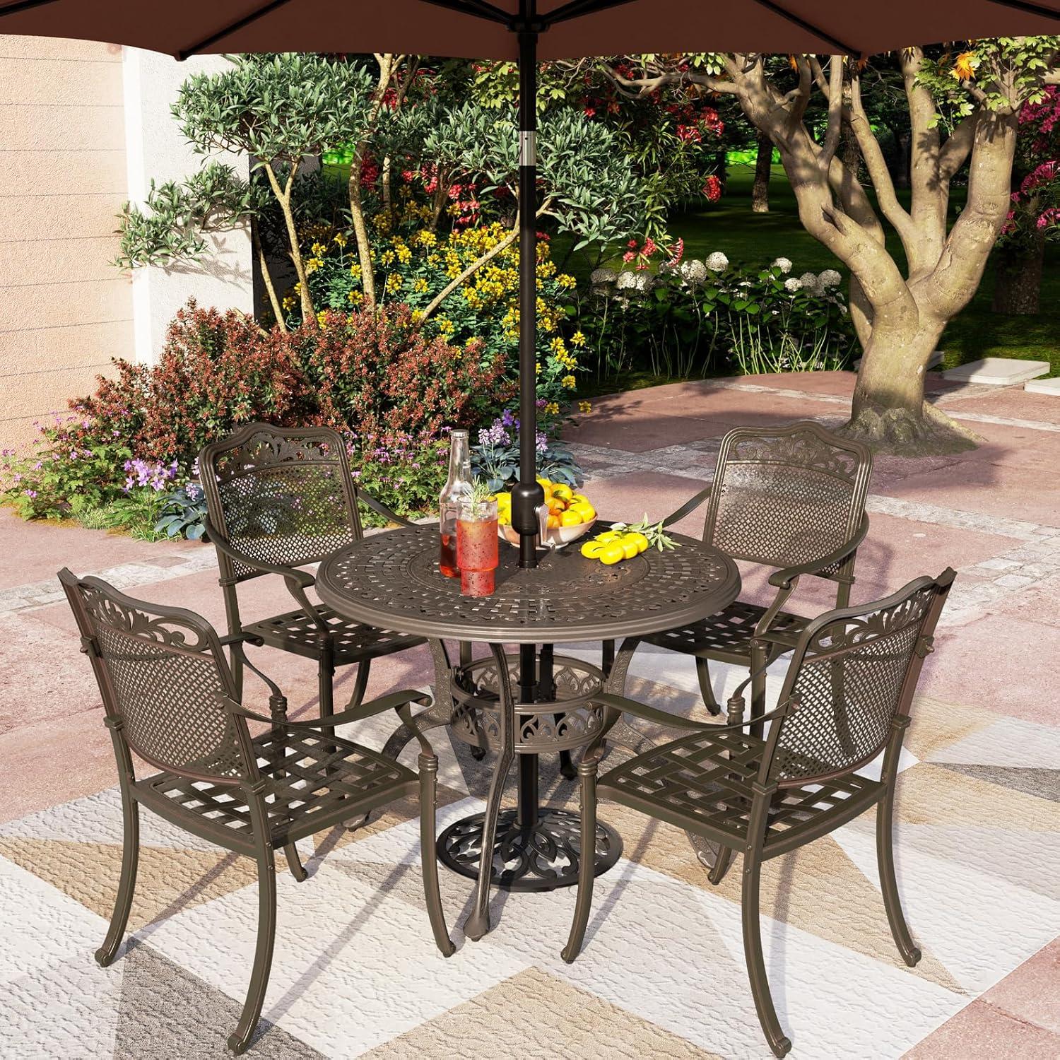The patio dining configuration features durable and weather-resistant cast aluminum construction, ensuring longevity and resistance against rust and corrosion. The elegant golden bronze finish not only enhances curb appeal but also provides comfort with its ergonomically designed chairs. with a spacious round table that measures 39 inches in diameter, there’s ample space for meals, snacks, and gatherings, making it perfect for family and friends in outdoor settings. The addition of a 1.97-inch umbrella hole allows for the installation of shade, enhancing comfort on sunny days. Additionally, the set is lightweight, which facilitates easy rearranging in various outdoor spaces such as yards, lawns, or gardens.