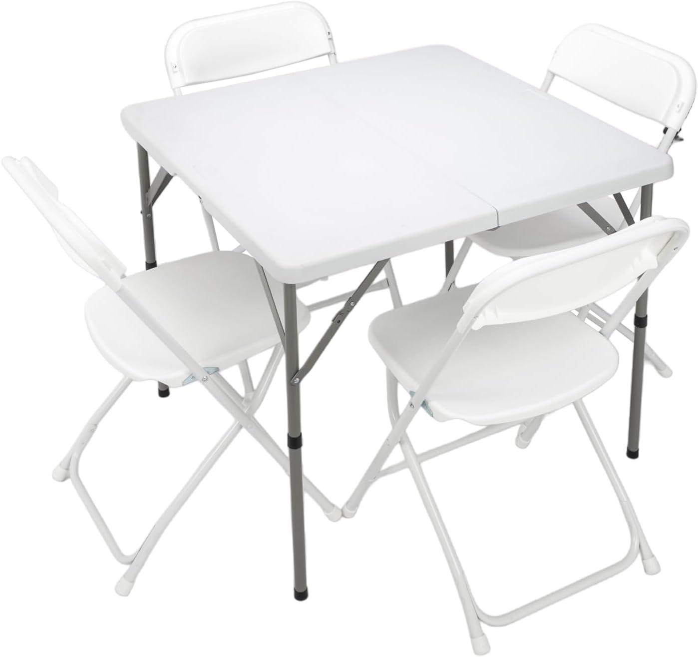 This versatile dining set features a 34-inch folding table paired with four sturdy plastic chairs, making it perfect for both indoor and outdoor activities. The durable plastic top is designed to withstand the rigors of outdoor use,while the heavy-duty metal frame ensures longevity and stability. Equipped with a locking system and non-slip glides, the table promises not only safety during use but also protects your floors from scratches. With ample seating for up to four people, this set is ideal for family gatherings, picnics, or even game nights at home.