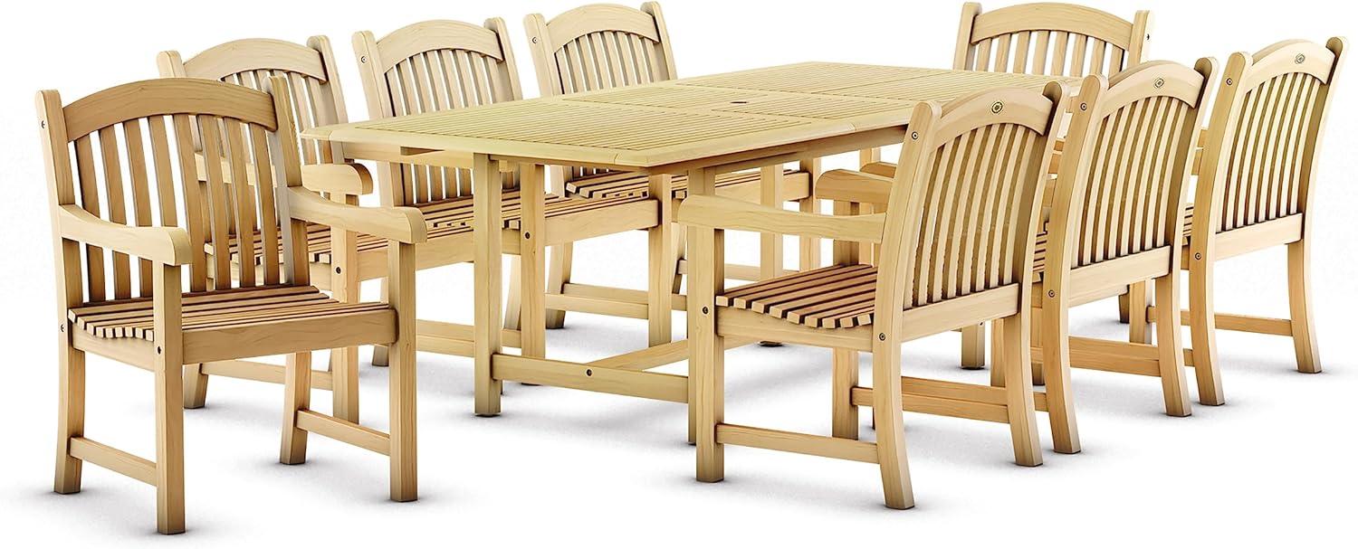 This elegant outdoor dining set is crafted from certified plantation-grown teak wood, offering durability and style for both indoor and patio use. With an extendable table feature, you can adjust the table length from 67″ to an impressive 87″, making it perfect for hosting larger gatherings or enjoying a quiet meal.The included eight chairs provide comfortable seating, all constructed to withstand various weather conditions, ensuring it remains a staple in your outdoor space year-round. Additionally, a 2-inch umbrella hole allows for easy sun protection, enhancing your outdoor dining experience.