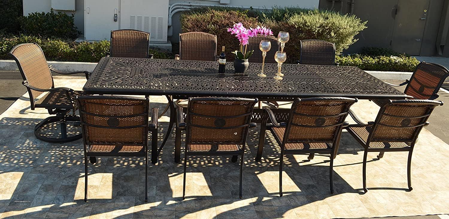 This exquisite 11-piece dining ensemble transforms your outdoor space into a charming retreat for family and friends. Crafted from high-quality cast aluminum, it features a robust five-stage powder-coated antique bronze finish that not only enhances its aesthetic but ensures lasting durability. The extendable table measures 48 inches wide and can extend from 84 to 132 inches, accommodating both intimate gatherings and larger celebrations. The set includes two swivel rockers and eight stationary chairs, all designed with premium cushions for added comfort, making it perfect for long summer evenings outdoors. The built-in umbrella hole provides practicality, allowing you to enjoy shade as you dine or entertain.