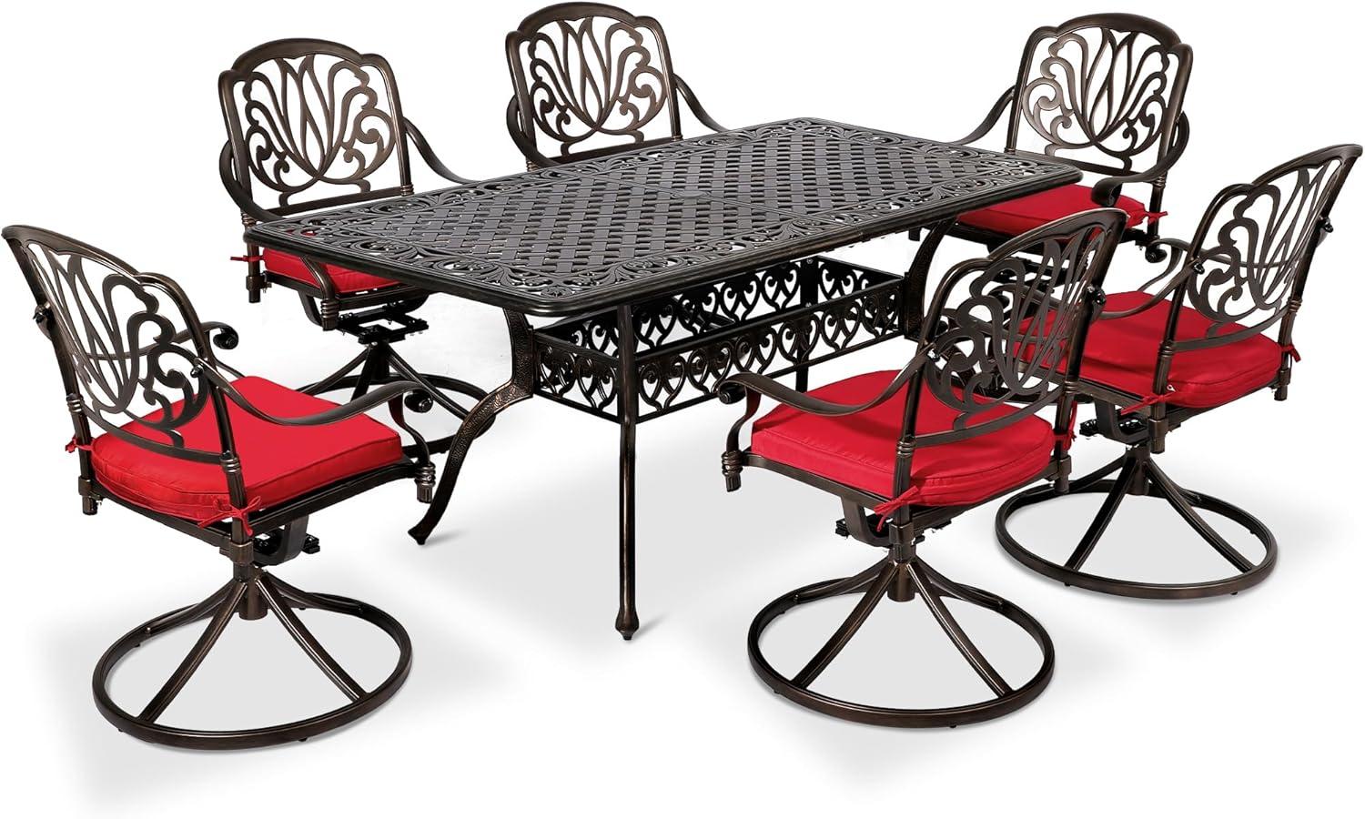 This outdoor dining furniture is crafted from high-quality cast aluminum, ensuring weather resistance and lasting durability. The set includes six swivel chairs that feature cushioned seats for maximum comfort, perfect for long meals or relaxed gatherings. The elegant design adds charm to any patio, garden, or poolside, while the ability to accommodate an umbrella makes it a great choice for sunny days. Moreover, the splicing design of the table allows for compact storage, making it easy to integrate into any outdoor space.