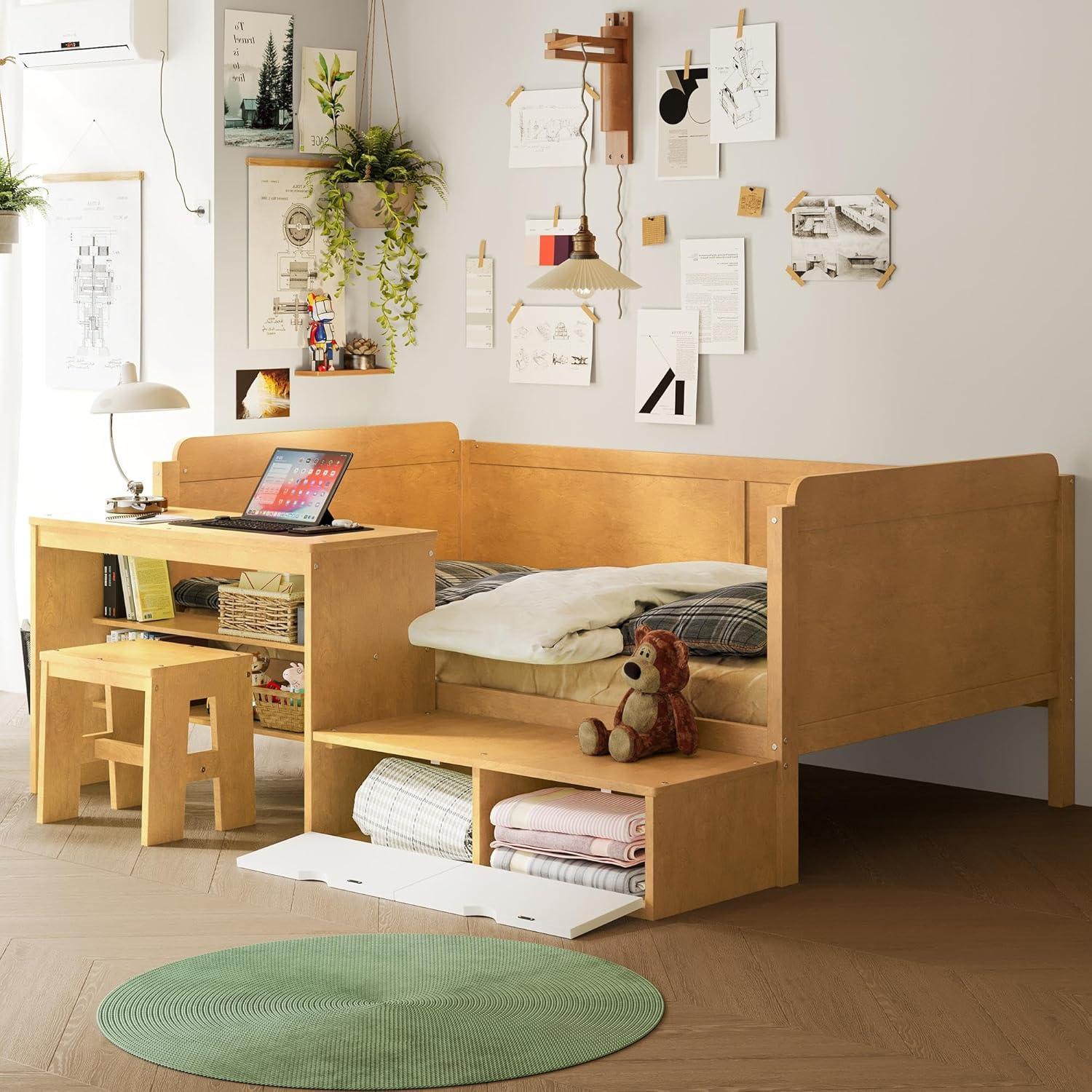 This cozy twin-size bed combines a stylish design with practical features, making it an excellent addition to any child’s room. The built-in study desk is perfect for homework or crafts, while ample storage compartments such as shelves and lockers help keep the area organized and clutter-free. Crafted from high-quality wood,this durable piece not only ensures stability and longevity but also adds a touch of elegance to the overall decor. The matching stool provides extra seating, enhancing its functionality without occupying additional space, allowing kids to comfortably transition from rest to study.While this daybed boasts many advantages, it does require assembly and shouldn’t be paired with a box spring. Parents need to supervise children when using this product, and it should be placed away from heat sources or hazards. The space-saving design is ideal for smaller rooms, but those with larger spaces may find it less optimal. Nonetheless, this multifunctional setup is a great way to maximize both comfort and utility in your child’s bedroom.Explore Now!