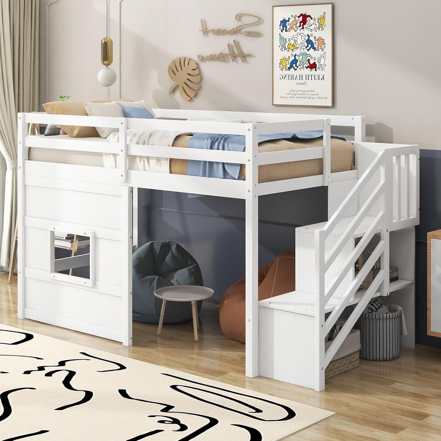 Wood Loft Bed with Storage Staircase and Window,No Box spring Required, Twin Size, White