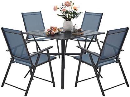 This outdoor dining furniture collection brings both functionality and modern style to your garden, deck, or backyard. Comprised of four lightweight, foldable chairs and a square dining table, it’s designed for versatile use. The breathable Textilene fabric on the chairs ensures comfort and resilience in varying weather conditions. The classic slatted tabletop is constructed with a durable e-coated metal frame, increasing resistance to rust and prolonging its life even with regular outdoor exposure. Notably, the table features a 1.57″ umbrella hole, providing excellent sunshade opportunities when hosting guests outdoors.