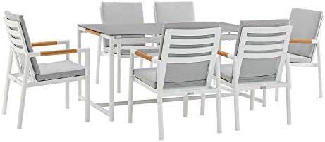Armen Living Royal 7 Piece White Aluminum and Teak Outdoor Dining Set with Light Gray Fabric