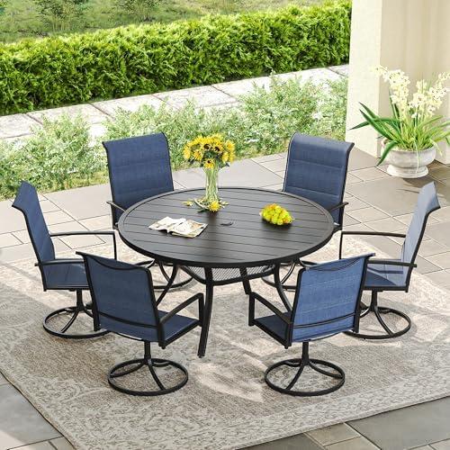 This outdoor furniture set combines a chic design with practicality, making it an excellent addition to your garden, porch, or yard. The 47.2″ round black dining table features a built-in shelf that provides extra storage space for your items, while the adjustable umbrella hole (1.57″-1.90″) accommodates various umbrella sizes to shield you from harsh sunlight or light rain. Accompanied by six blue Textilene swivel high-back chairs, each designed with ergonomic support and curved armrests, this set promises comfort for leisurely meals. Plus, the chairs effortlessly rotate 360 degrees, adding an enjoyable dimension to your outdoor dining experience.