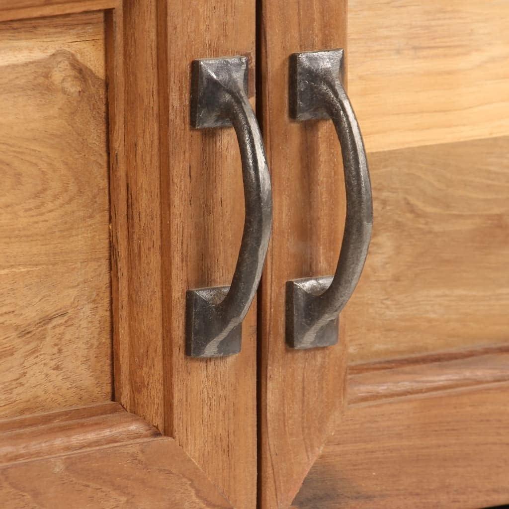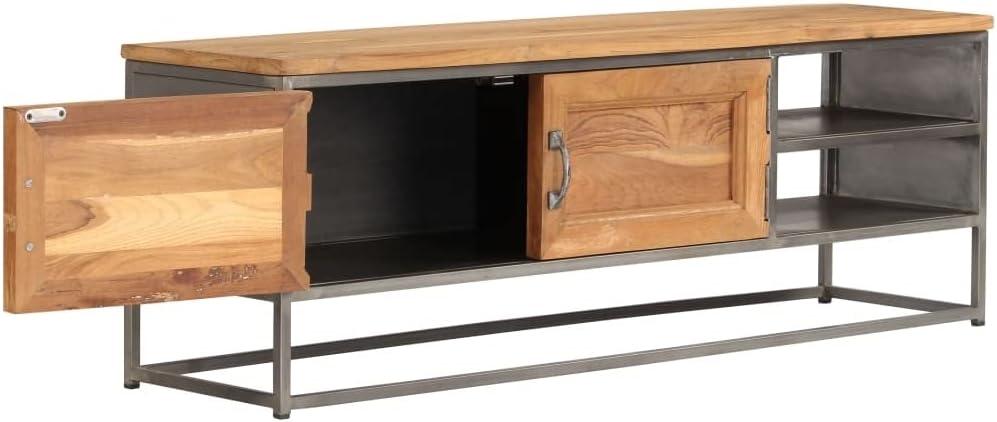 You notice it before the screen warms up: a low, linear block of warm teak that settles the eye. The TV media Console Television entertainment Stand — a recycled teak-and-steel lowboard — spans about four feet, its polished grain catching the late-afternoon light. run your hand along the edge and the wood reads smooth and slightly lived-in, while the steel frame feels cool and matter-of-fact beneath. It sits modestly low and narrow, more visual ballast than showpiece, the knots and varied tones making each glance a new detail. You find the piece quietly organizes the lower half of the room, drawing attention without shouting.