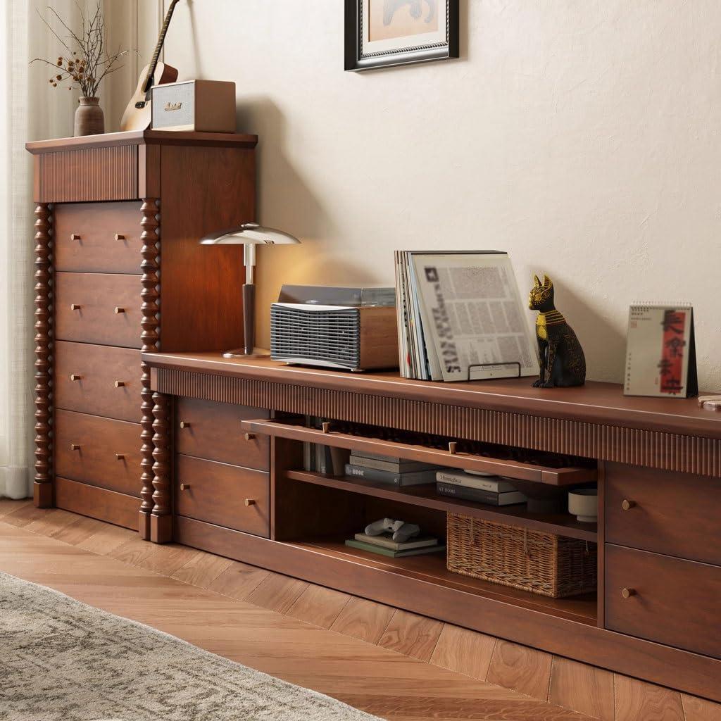 Over time you notice how the tv Stand Cabinet Retro Solid Wood TV Cabinet Villa settles into the room, less an announcement than a steady presence as the living room is used.It quietly reshapes how space is used—shelves collect remotes and magazines, the top takes on lamps and the occasional laptop—and the surfaces pick up faint scuffs and the soft darkening of regular touch. In daily routines it becomes part of the small movements you repeat: setting down a cup, reaching for a cord, leaning against it while the TV is on, folding itself into regular household rhythms. After a while it simply rests.