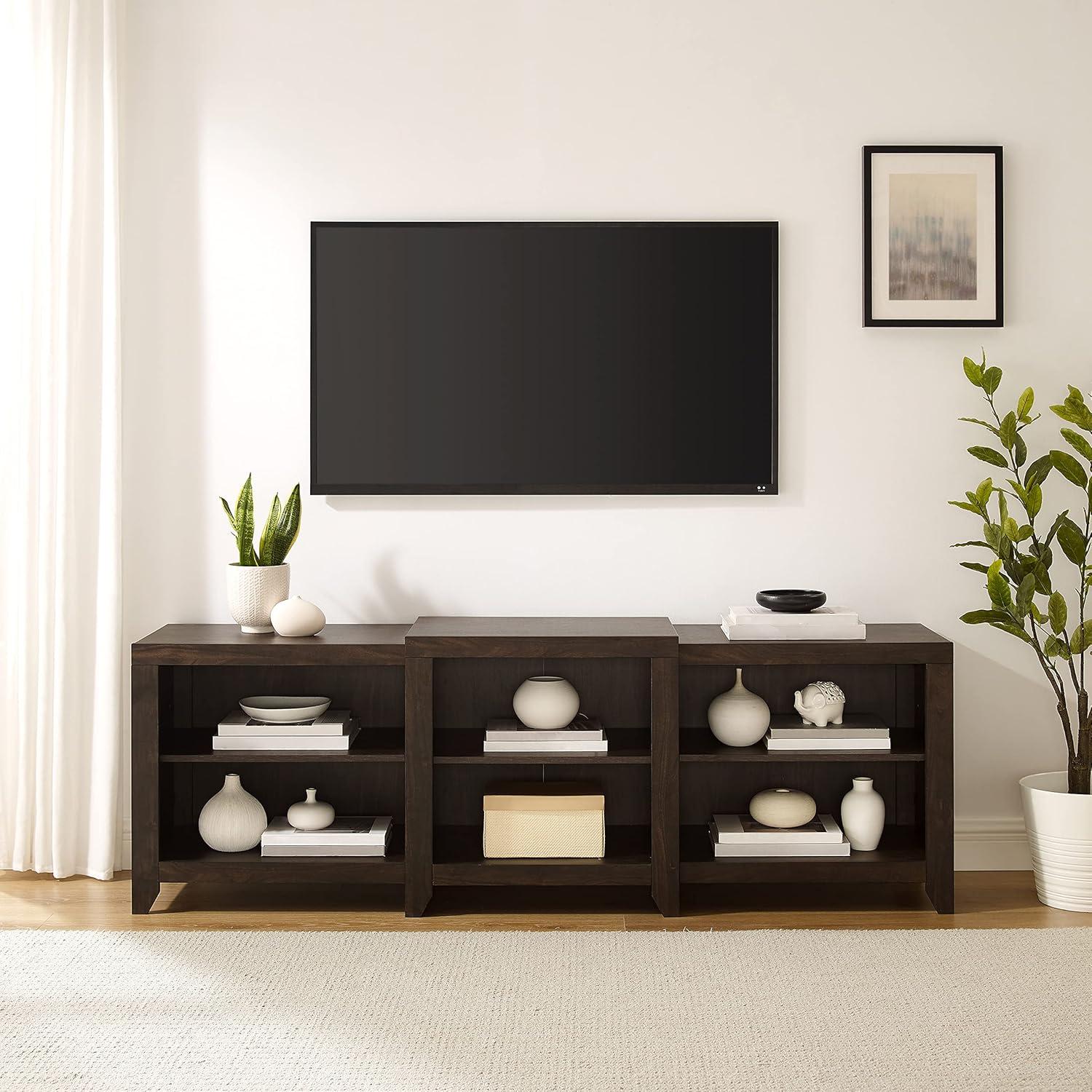 This low-profile media console strikes a fine balance between style and functionality. With its dark walnut finish and tapered legs, it seamlessly blends into a variety of interior themes-from farmhouse coziness to mid-century modern charm. The open cabinets with adjustable shelving allow for flexible storage options, making it easy to organize consoles, streaming devices, and other accessories without overcrowding your space. We especially appreciate the built-in cable management system which helps maintain a clean, clutter-free entertainment area. Plus, the sturdy construction supports TVs up to 75 inches and 100 pounds, ensuring peace of mind when setting up your biggest screen.