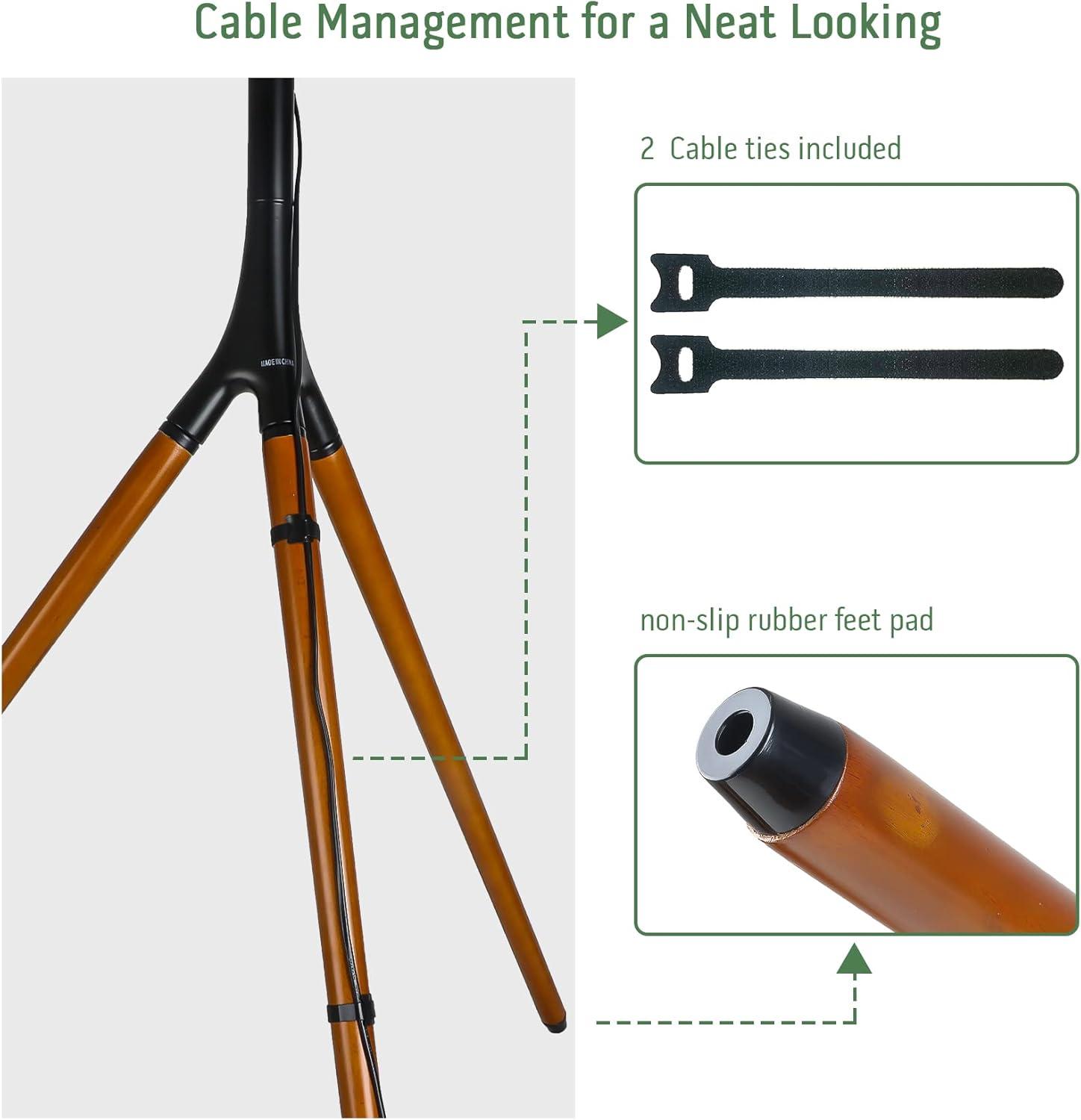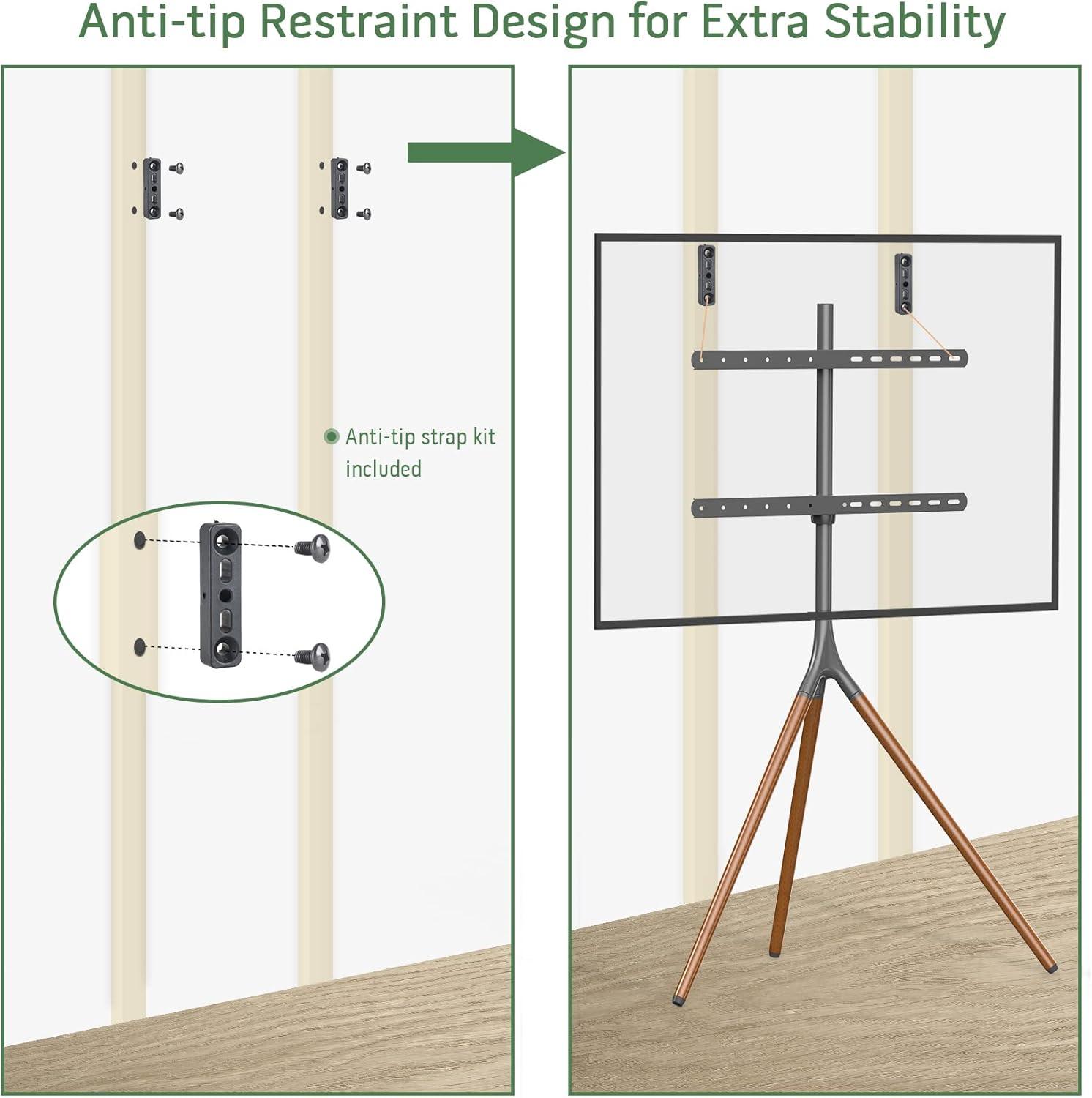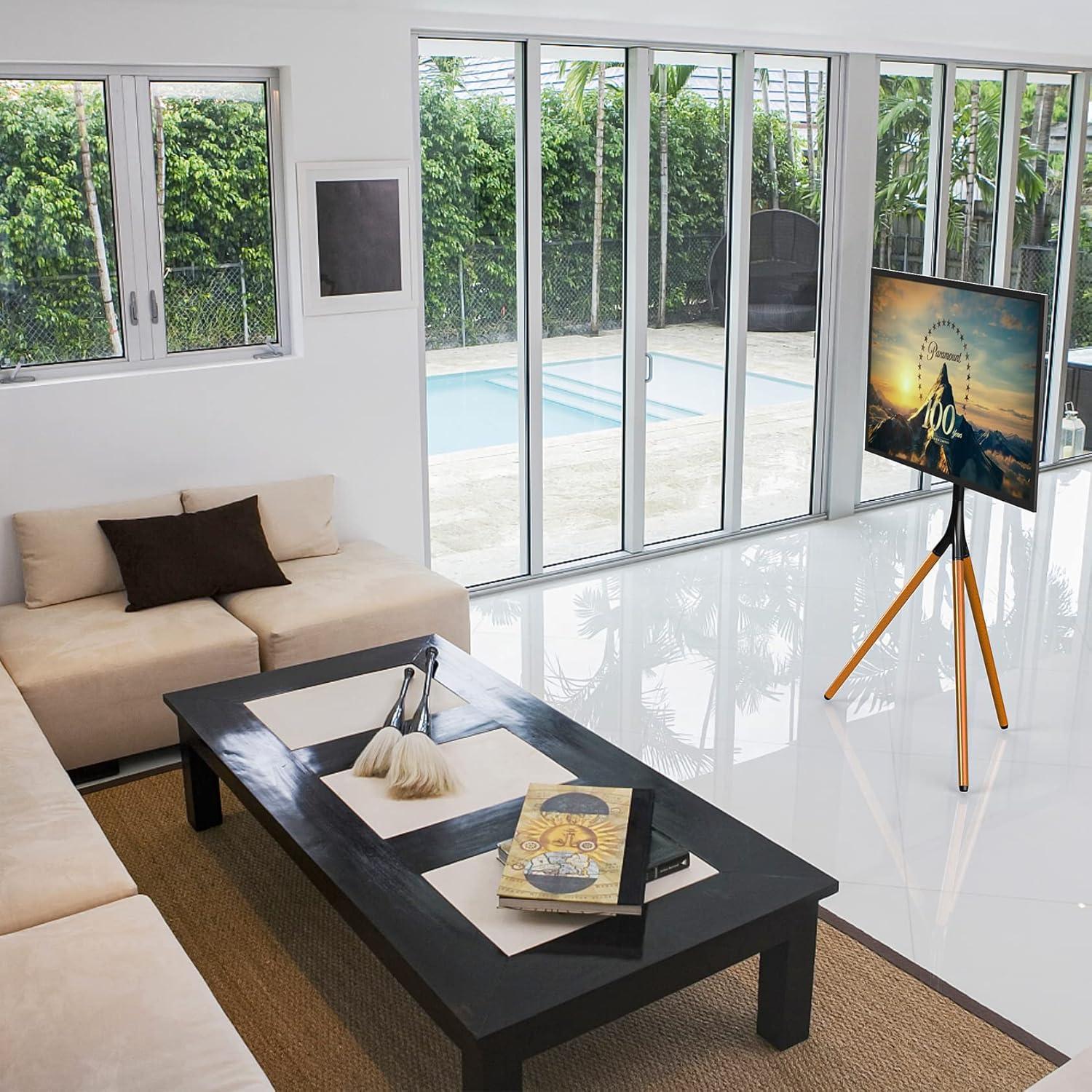 caught by the silhouette first: three wooden legs splay like a painter’s easel, their matte beech finish warming the black metal spine under the living room lamp. You notice the screen seems to float on a slim pole that rises just over four feet, giving the whole piece a light, gallery-like presence rather than the bulk of a cabinet. You can feel the coolness of the steel if you touch the pole and the slight give of rubber pads under each leg when you nudge the base; the tripod reads solid and quietly confident underfoot. You quickly recognize it as the UPGRAVITY Easel TV Stand with tripod Base, though you’d probably just call it the easel stand when pointing it out to someone. Swiveling the screen is effortless and the bundled cable ties keep the rear leg from becoming a messy spine, so from where you’re sitting the setup looks intentional and lived-in, not staged.