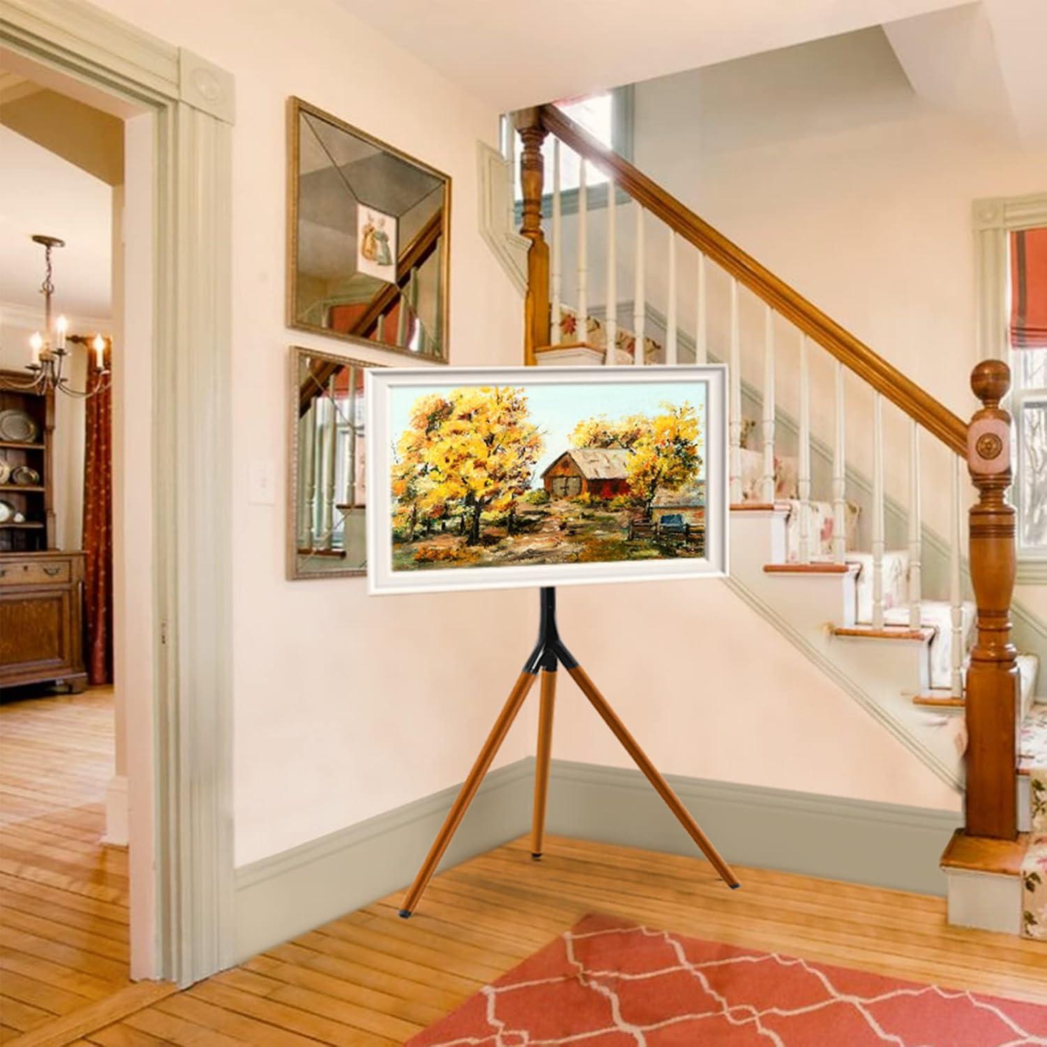 The stand’s tripod silhouette reads like a piece of furniture rather than a tech appliance: three slender legs lift the screen so it reads vertically and leaves the lower sightline open, which lets other elements—bookshelves, a rug, or a console—remain visually present. The matte black finish tends to absorb reflections,so the screen feels less like a glowing box in daylight and more like a framed image; under softer evening light the finish looks velvety and the wooden grain comes through in subtle patches. When you move around the room the easel-like profile changes its presence quickly—most frequently enough it recedes into a corner, occasionally asserts itself as a sculptural anchor if placed against a pale wall.