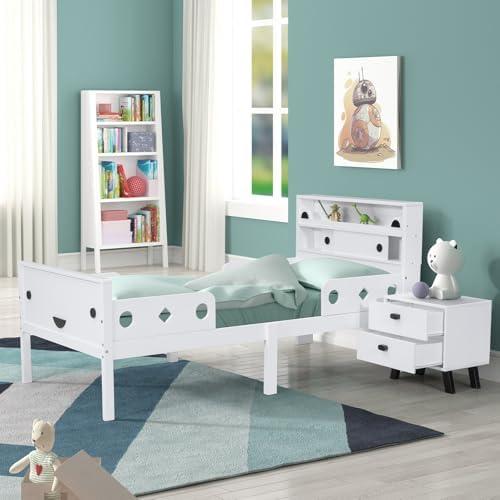 This elegantly designed twin bed not only offers a cozy sleeping space but also incorporates playful elements that appeal to children. Featuring a charming bear shape, it brings warmth and comfort to any child’s bedroom. The accompanying small nightstand is perfect for keeping books and small toys within easy reach, promoting organization in a fun way. Made from high-quality pine and MDF, the bed is durable enough to withstand the tests of time while ensuring the security of your little one with full guardrails. With dimensions of 82.6″L x 41.3″W x 38.8″H, it easily fits into various room layouts without being cumbersome.