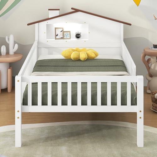 Stylish Floor Bed Frame with Roof & Safety Guardrails for Kids