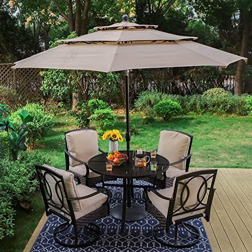 This outdoor dining collection brings comfort and style to your deck, garden, or yard with its heavy-duty construction and thoughtful design features. The set includes four spacious swivel chairs, a round metal table, and a generous 10-foot umbrella, providing ample shading. The swivel chairs are not only stylish with their wicker accents but also designed for enhanced comfort, boasting curved armrests and padded cushions made of UV-resistant fabric. The table’s dimensions are suited for cozy gatherings and meals with family and friends, while the umbrella hole’s adjustable size allows for versatile use with your preferred shade solution.