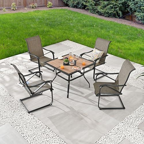 However, while the set’s bronze finish adds a touch of sophistication, a few potential downsides include the requirement for assembly, which some may find challenging, and the overall weight of the furniture, which could be difficult for one person to move. Additionally, the fixed design of the armchairs may not suit users who prefer a more adjustable option. Nevertheless, this patio dining set combines style and functionality, making it an attractive addition to your outdoor oasis.