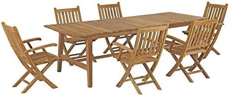 Crafted from high-quality solid teak wood, this outdoor dining set combines elegance with lasting durability. The rich wood grain adds a natural aesthetic, making it a beautiful addition to any patio or garden. The stylish planked wood top not only enhances its overall look but ensures stability during gatherings. The set includes a spacious table and six folding chairs, providing ample seating for family and friends. The use of all-weather cushions further enhances the comfort, allowing you to enjoy outdoor dining regardless of the season.