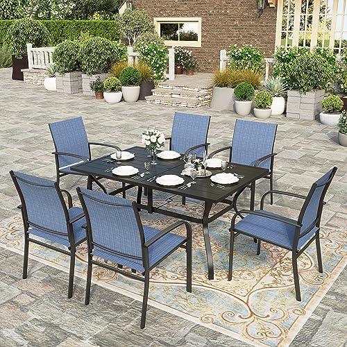 This versatile patio dining set combines functionality with modern design, featuring a rectangular table paired with six specially designed chairs. The breathable Textilene fabric ensures comfort, even during extended outdoor dining experiences, preventing that stuffy sensation typical of regular metal chairs. Each chair supports up to 300lbs, making it a robust choice for various users, while the elegant armrests add a sophisticated touch to outdoor settings. The three-layer coating on the wrought iron table provides lasting durability, making it resilient in all weather conditions, including rain and intense sunlight.