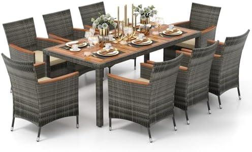 This outdoor dining solution features a generous rectangular table and eight comfortable chairs, making it ideal for hosting family and friends. Constructed from solid acacia wood and weather-resistant rattan, the set ensures durability and style for various outdoor settings such as patios, gardens, poolside areas, and backyards. The spacious table provides ample room for food and drinks, supporting up to 360 lbs. Each chair is designed for comfort, featuring an ergonomic backrest and wide armrests, plus a weight capacity of 400 lbs. The included waterproof cushions provide added coziness and can be easily removed for maintenance, enhancing the overall functionality of the dining set.