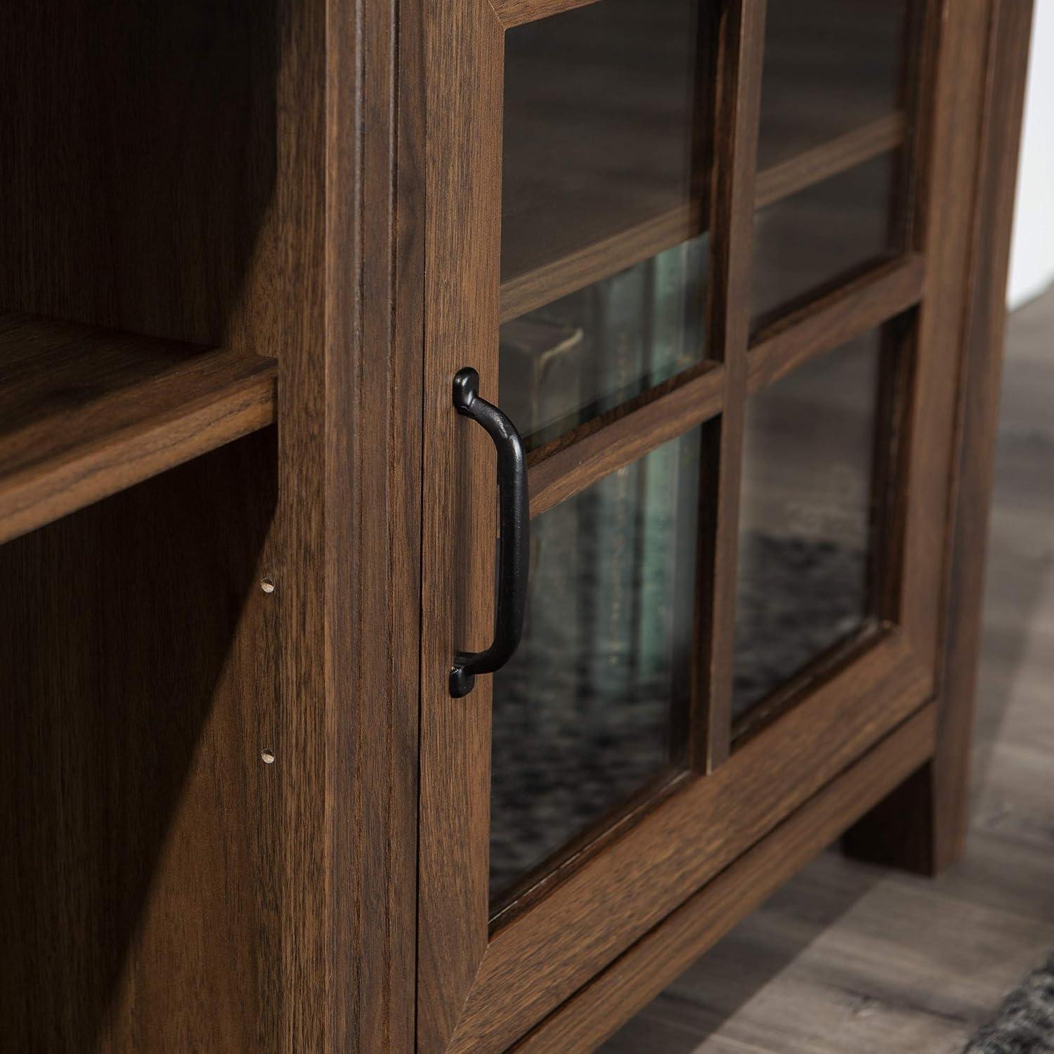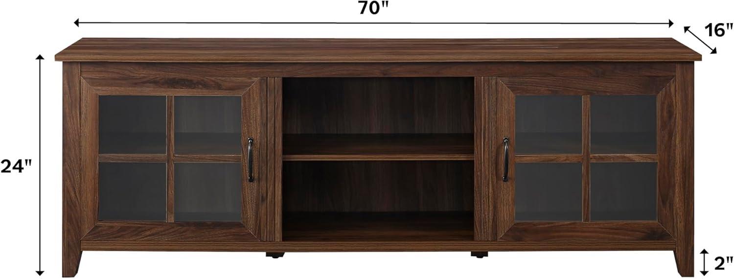 You watch light skim the dark walnut top and catch on the window-pane glass; for a moment the whole console reads like a low-slung bookcase you’ve already lived with. The Walker Edison Portsmouth Classic TV stand settles into the room with a quiet conventional grain—its edges feel solid under your hand, the finish slightly textured rather than slick. You notice the visual weight before the finer points: the panes and open center cubby break the bulk into familiar pockets where things can sit without shouting. Pull a door and it gives a soft spring click; the shelves carry that faint factory scent that fades after a day of airing. By evening the walnut deepens under lamplight and the piece starts to feel like part of the room rather than something newly assembled.
