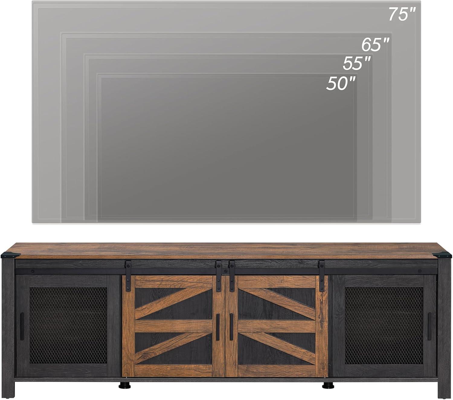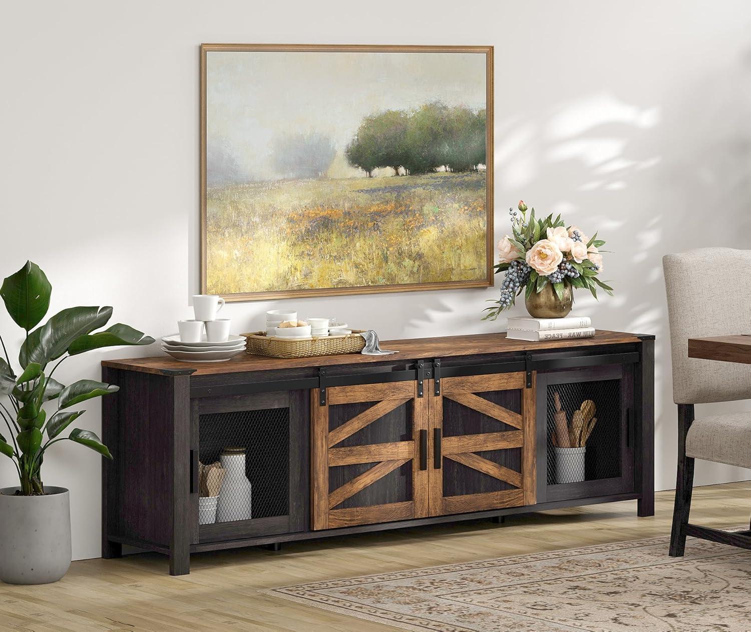 In your living room, WAMPAT’s Farmhouse TV stand in dark walnut and black settles in with a low, steady visual weight that feels more like furniture than a boxy electronics perch. Up close the wood-tone surface reads weathered rather than glossy, and your hand picks up the slight give of engineered board beneath the finish. The two sliding barn doors glide on a cool metal track—quiet, with just enough resistance to feel well-mounted—while the mixed wood-and-metal leg ensemble lends an unexpectedly grounded stance.Stand back and the console’s proportions announce themselves: wide,layered,and ready to host a sizable screen and the stray stack of remotes and books that live on your coffee table.