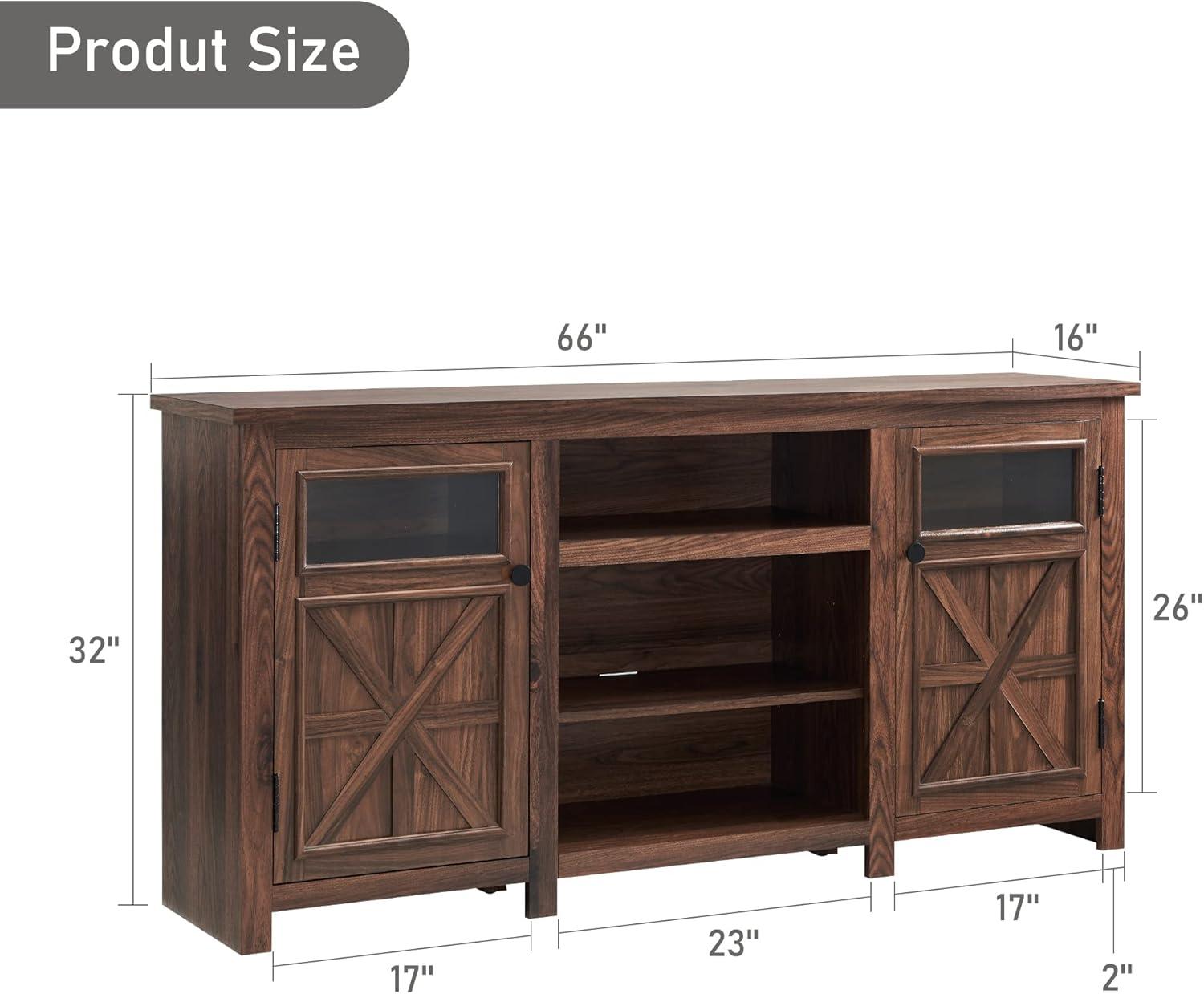 Upon unpacking,we were immediately drawn to the charming blend of customary farmhouse aesthetics with modern accents. The classic double-cross barn doors, highlighted by sleek obvious glass trim, make this piece a stylish focal point in any living room. Measuring 66″ wide, 16″ deep, and 32″ high, it comfortably accommodates TVs up to 75 inches, while offering a spacious 1.2″ thick tabletop capable of holding up to 150 pounds, ideal for showcasing decor like family photos or greenery.the warm brown finish complements most decor styles, creating a cozy yet contemporary vibe that blends well with various interiors.