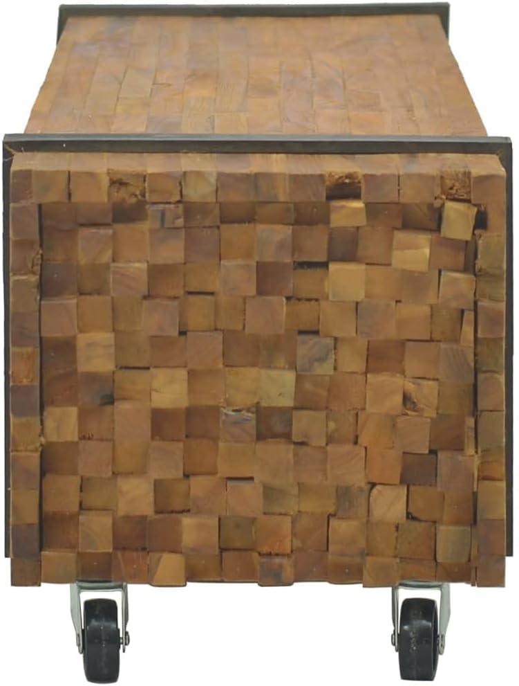 After spending time with this piece, we appreciate how its blend of industrial charm and natural teak wood elevates the ambiance of any living space. Its design, resembling stacked beams held by black belts, adds a unique visual texture without overwhelming the room. The sturdy top provides ample room-not only for a sizable TV but also for decorative touches like plants and artful baskets. We found the natural finish both beautiful and practical, making the surface easy to maintain and resistant to everyday wear. Thanks to the four wheels, relocating it around the room or to another area is surprisingly effortless, allowing for flexible living arrangements.