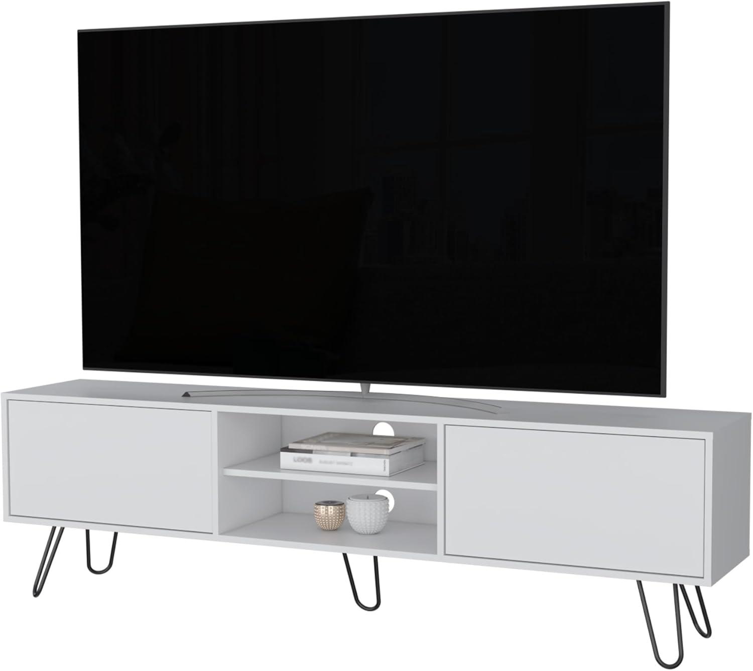 After spending time with this sleek and functional entertainment unit, we appreciate how it balances modern aesthetics with practical storage solutions. Its expansive top surface easily accommodates TVs up to 55 inches, making it an excellent centerpiece for a living room.The two spacious drawers offer a clever way to tuck away remotes, gaming gear, or DVDs, keeping clutter out of sight while maintaining a clean look. The open central compartments with cable management ensure your media devices can be connected discreetly, avoiding tangled wires and improving overall tidiness. Perched on five elegant hairpin legs, this piece adds a distinctive touch of mid-century charm without compromising stability.