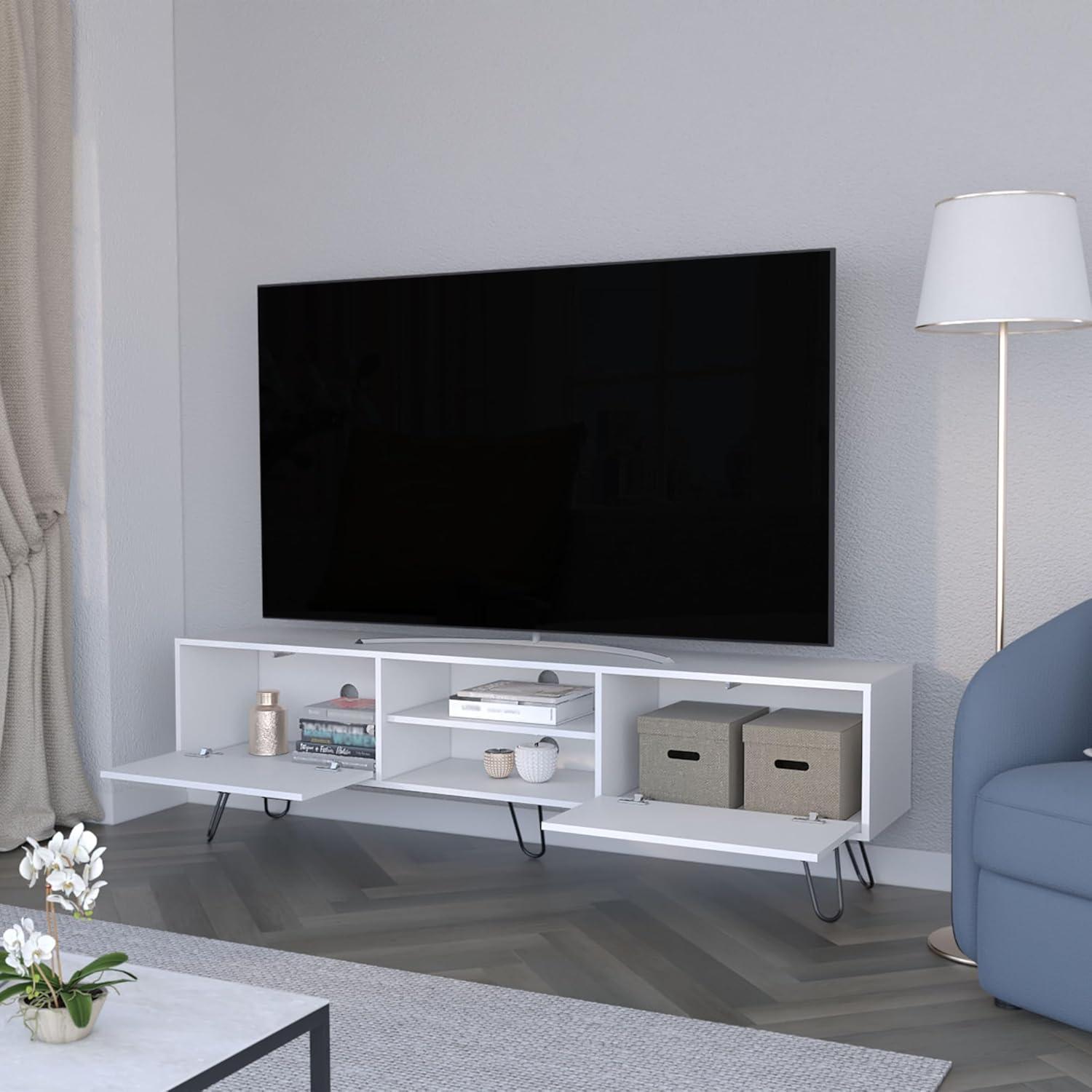 Blending sleek modernity with practical functionality, this TV rack stands out as an inviting centerpiece for any living room. its expansive top surface comfortably supports TVs up to 55 inches, ensuring ample space not only for your screen but also for decorative accents. The choice of a refined manufactured wood finish-available in either black or white-adds a subtle touch of contemporary elegance that complements various interior styles. The standout feature lies in the five distinctive hairpin legs, which not only lend an industrial-chic vibe but also provide stable support, elevating the entire assembly comfortably off the ground.