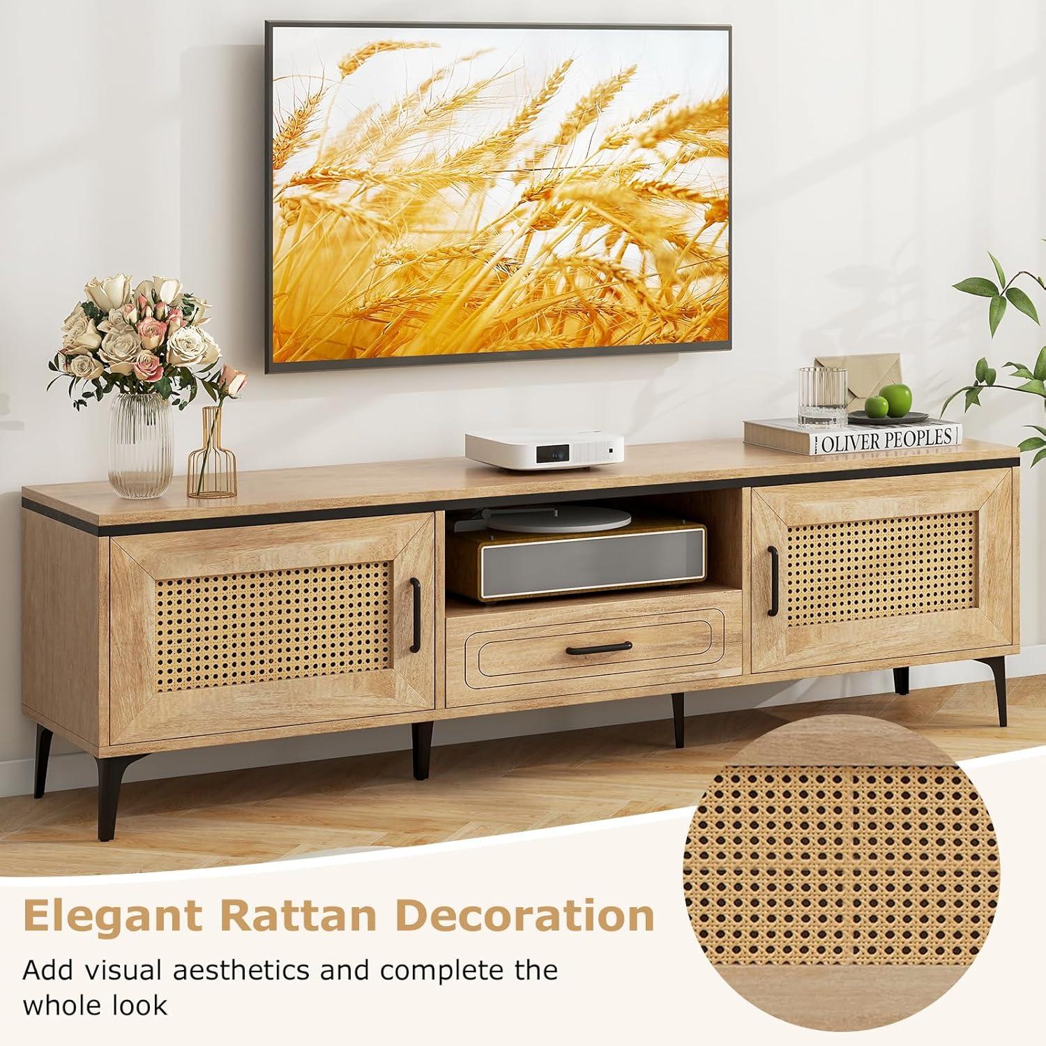 This media console instantly captivates with its balanced blend of mid-century modern and boho aesthetics, featuring a warm oak finish paired with delicate rattan accents on the cabinet doors.The imitation wood grain texture and sleek line carvings enrich its visual appeal, creating a natural yet sophisticated focal point for any living room. Elevated on six sturdy metal legs with non-slip pads, the stand exudes stability and offers practical benefits like easy robot vacuum access underneath, making it as functional as it is stylish.