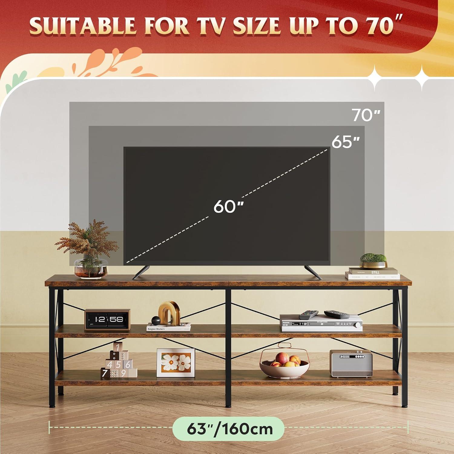 When integrating this entertainment center into our living or bedroom areas, we find its 63-inch width and 24-inch height perfectly balances presence without overwhelming the space. The industrial rustic brown finish complements a variety of décor styles, from modern minimalist to cozy cabin aesthetics. In tighter rooms, placing it against a wall frees up floor space while the 14.2-inch depth ensures it won’t jut out excessively. To maximize its utility, we recommend positioning the unit so that the three-tier wooden shelves are easily accessible, allowing quick storage or display of books, speakers, or DVDs without cluttering tabletops.