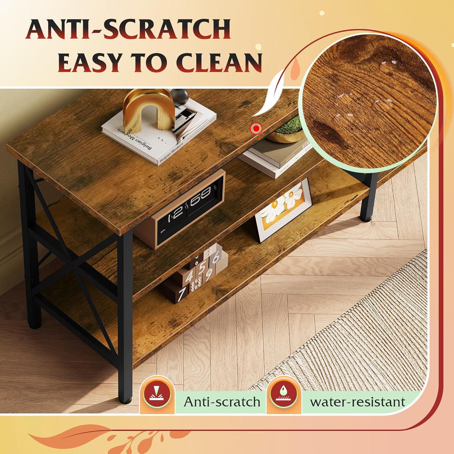 After using this entertainment center for several weeks, we can confidently say it balances durability and style perfectly for our home setup. The X-shaped steel frame gives it remarkable stability,and the high-quality MDF board withstands daily wear without warping or showing scratches. The 150 lbs tabletop capacity comfortably supports our large TV and additional décor, making it a reliable piece without any signs of strain. Its rustic brown finish seamlessly complements various rooms, adding a subtle industrial charm that enhances our living room’s ambiance.