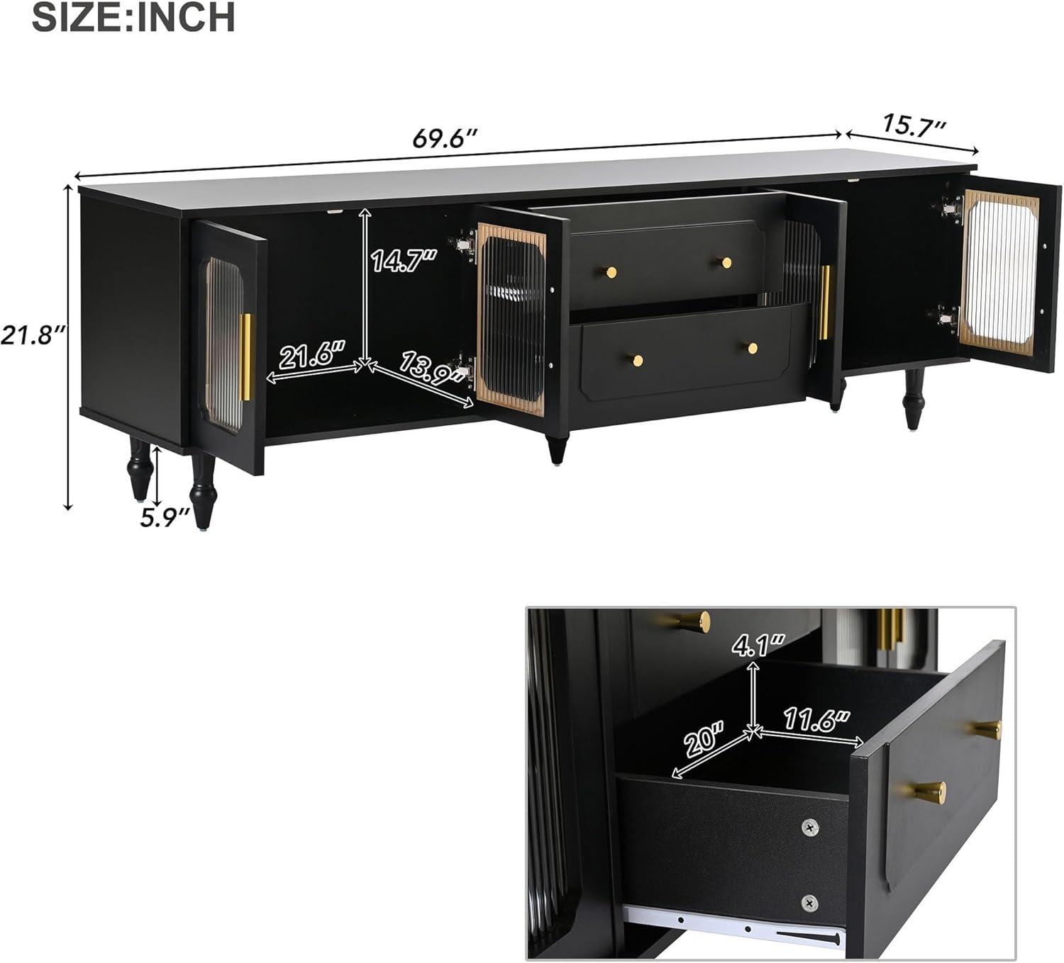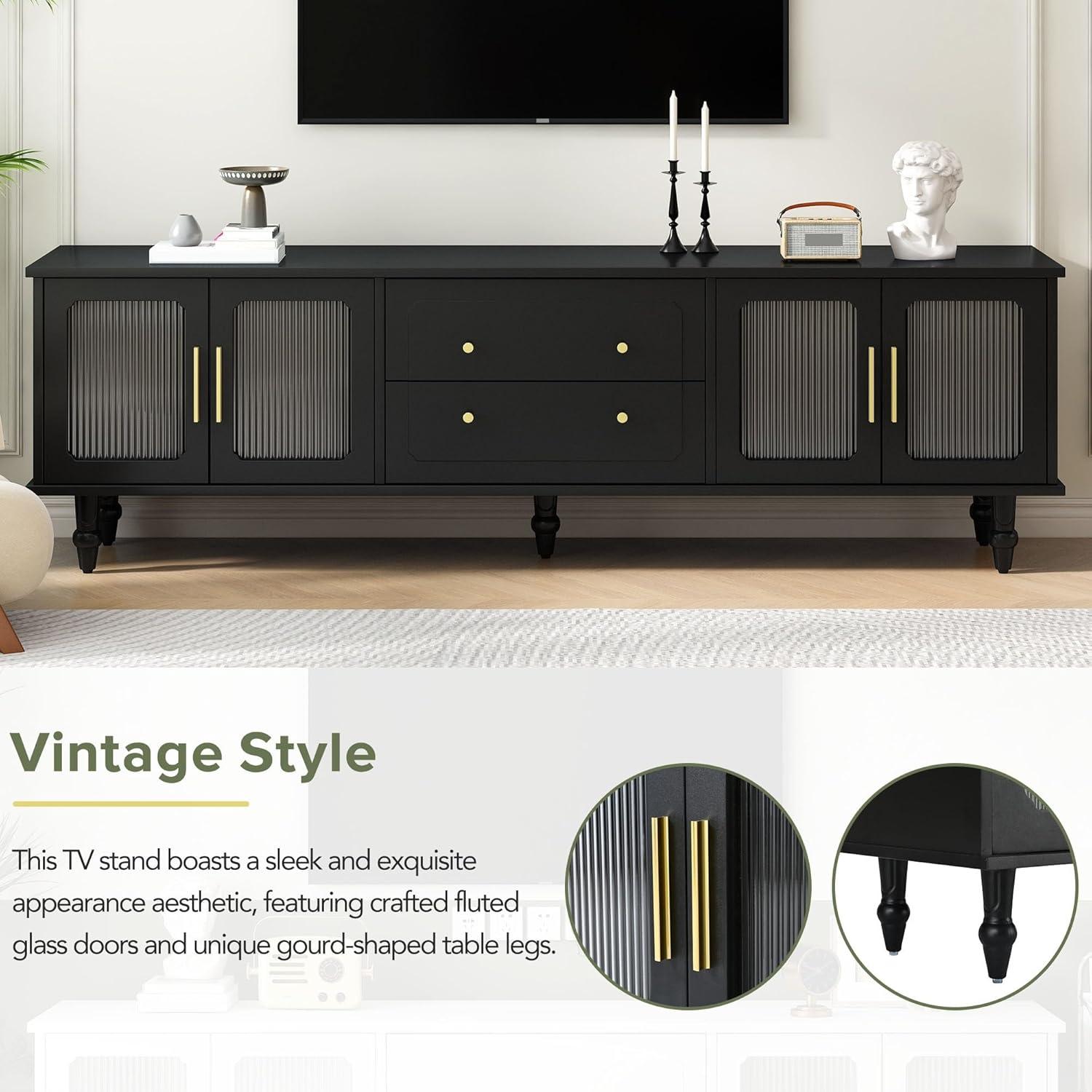 Beyond size compatibility, this media console harmonizes well with various entertainment setups due to its functional design and elegant aesthetic. The two spacious drawers and dual cabinets with transparent fluted glass doors not only provide generous storage but also enhance spatial openness by allowing natural light to filter through. This feature works beautifully in rooms with diverse decor styles, blending retro vibes with contemporary accents seamlessly. Plus, the gold-tone metal handles and modern wave-pattern cabinet doors add a touch of sophistication without compromising practicality.