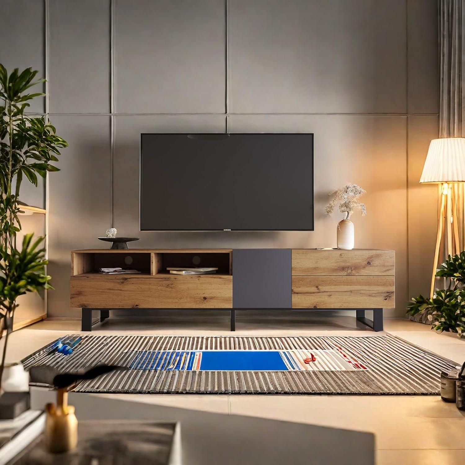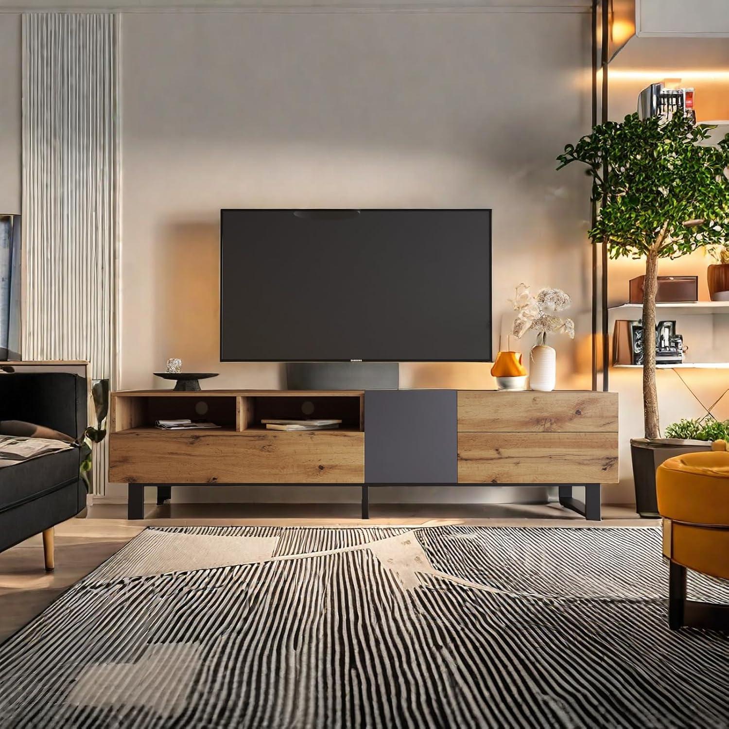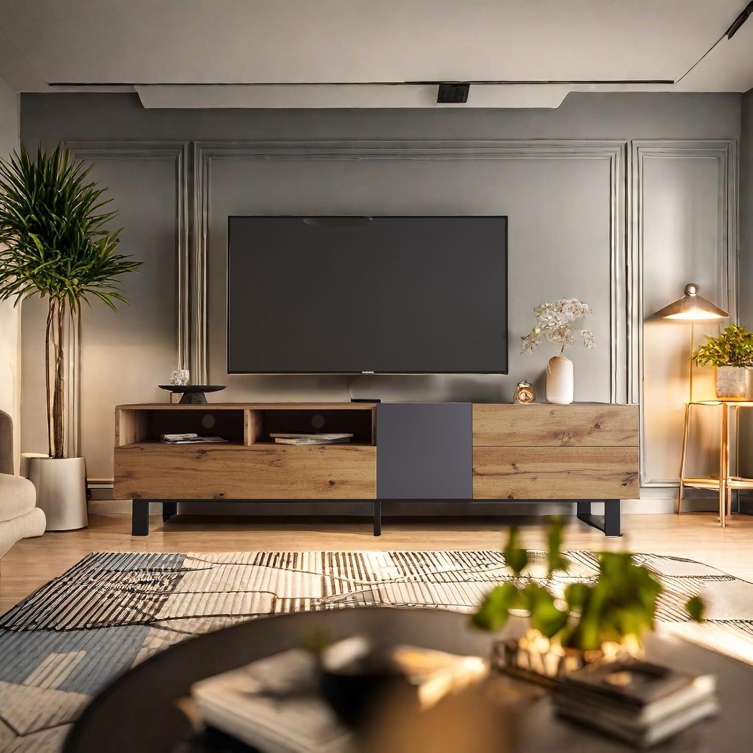 We immediately noticed the seamless blend of modern minimalist style and practical design. The clean lines and geometric structure provide a sleek silhouette that complements a variety of interiors without overwhelming the space. Its clever use of color matching enhances visual cohesion, making it a subtle yet stylish centerpiece in our living room.Beyond aesthetics, the build quality is robust, crafted from durable wood materials that support TVs up to 80 inches with great stability. The thoughtful drop-down doors facilitate smooth access while maintaining a tidy appearance, and the double storage compartments, including two spacious drawers, accommodate everything from gaming consoles to decorative pieces.